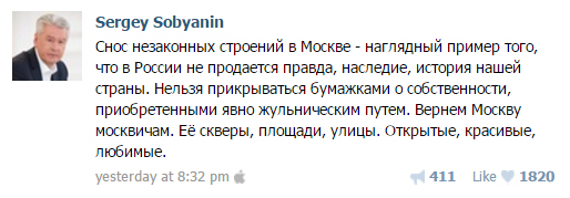 Наконец-то сказаны главные слова об устройстве современного российского политического режима. Откуда не ждали, что называется. Мэр Москвы Сергей Собянин о сносе торговых павильонов в городе Москве: «нельзя прикрываться бумажками о собственности, приобретенными жульническим путем»; «снос незаконных строений в Москве - наглядный пример того, что в России не продается правда, наследие, история нашей страны».
