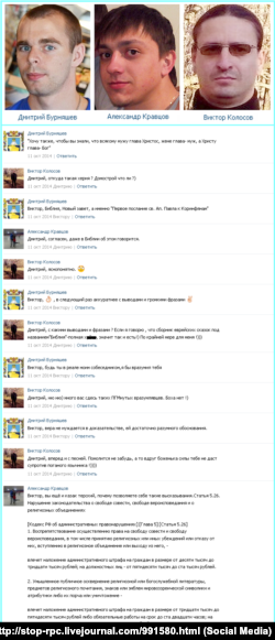 В комментариях к посту развернулось обсуждение, в котором были затронуты и религиозные вопросы. В частности, пользователь Дмитрий Бурняшев написал: "Хочу также, чтобы вы знали, что всякому мужу глава Христос, жене глава – муж, а Христу глава – Бог". Это цитата из Первого послания коринфянам, однако в комментарии это не было упомянуто. Виктор Краснов (Виктор Колосов – в сети) отреагировал на послание так: "Дмитрий, откуда такая херня? Домострой, что ли?". Дальше развернулась дискуссия между Бурняшевым, Красновым (Колосовым) и еще одним пользователем – Александром Кравцовым. Краснов, среди прочего, написал, что "Боха нет!" и назвал Библию "сборником еврейских сказок". Сейчас эта переписка сохранилась в социальной сети не полностью, часть постов Бурняшева и Кравцова удалены.