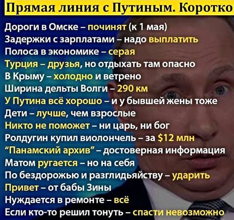 Путина просили разобраться с дорогами в Омске (тут же разобрался) и с невыплатой зарплат рабочим на острове Шикотан (тут же завели уголовное дело на директора рыбокомбината).