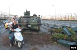 Около часа ночи было заблокировано передвижение по главным автомагистралям страны. Власти закрыли мосты через Босфор, соединяющие азиатскую и европейскую части Стамбула. У въезда на магистрали скопились тысячи автомобилей. Началась паника. Сообщалось о нескольких массовых драках, перестрелках и десятках пострадавших. Власти временно закрыли стамбульский аэропорт и аннулировали все международные рейсы. Дали только разрешение на приземление прибывающим воздушным судам. Около двух ночи к аэропорту прибыла колонна танков, большая группа полицейских и машин скорой помощи. В зале ожидания скопились сотни пассажиров, люди сидели на полу из-за отсутствия места. В интернете стали распространяться слухи о том, что Реджеп Эрдоган бежал из страны. Появились сообщения, что он якобы запросил разрешение на вылет в Германию. Вскоре президент сделал заявление по телефону в прямом эфире. Он казался напуганным и неуверенным. Он призвал защищать демократические завоевания республики и обещал, что совершившие попытку военного переворота сильно пожалеют об этом.
