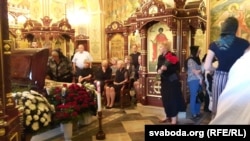 В храме рядом с гробом сидели самые близкие люди, в том числе мама Людмила Станиславовна, жена Наталья, подруга и коллега Алена Притула, дети Елизавета и Николай.