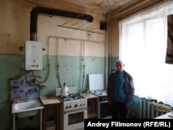 Внутри классическая коммуналка с общей кухней. Покрытый трещинами потолок и голая лампочка, соединенная с электрощитком наружной проводкой.