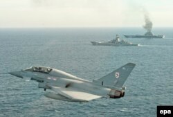 Изображения, опубликованные британским министерством обороны, показывают самолеты британских ВВС "Тайфун" и фрегат "Сент-Олбанс", которые сопровождали "Адмирала Кузнецова" и суда поддержки в Ла-Манше, когда они шли к Северному морю.