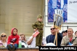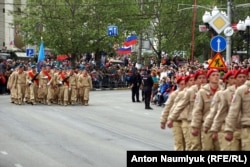 Парад в честь Дня Победы в Симферополе в этом году впервые проводился с военной техникой. По проспекту Кирова проехала колонна из ГРАДов, БТР и баллистических ракет. На броне сидели вооруженные солдаты, но в этот раз лиц не скрывали: махали руками и улыбались. По обе стороны дороги за ограждением и полицейским оцеплением стояла толпа, которая шумела волнами с каждой новой бронированной машиной.