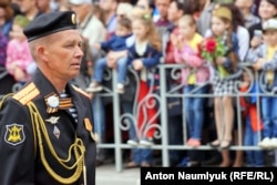 По дороге проходят дети, сначала в форме кадетской школы, потом в песочном камуфляже. За ними в такой же "песчанке" с оружием хмурые мужики, над ними флаг – "Русское единство". В толпе очень нетрезвый мужчина в накидке "Русского единства" начинает свистеть и махать руками, на него ругаются мамы с детьми, и он, пошатываясь и опираясь на чужие плечи, уходит.