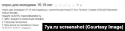 Радио Свобода удалось найти и другие объявления о наборе людей для фокус-групп об Алексее Навальном. Все они были размещены уже после митинга сторонников политика, состоявшихся в российских городах 12 июня. Отличается в этих объявлениях лишь желаемая организаторами аудитория исследований: "Мужчины и женщины 17 лет, сторонники и противники Навального", "Девушки 17 лет, противницы Навального", "Девушки 15–16 лет, сторонницы Навального". Платят за участие в этих фокус-группах 1000 рублей. Рекрутер, чьи контакты указаны под этими и другими объявлениями о наборе в фокус-группы о Навальном, в ответ на письма Радио Свобода ответил, что "не обладает информацией" о том, кто является заказчиком исследований.