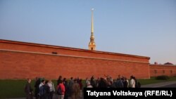 Затем участники митинга переместились к Головкину бастиону Петропавловской крепости и возложили цветы на месте расстрелов, произведенных ЧК. Активистка петербургского Научно-информационного центра "Мемориал" Евгения Кулакова считает, что на этом месте должен быть памятник, и выражает возмущение тем, что кости заложников, расстрелянных без суда по сословному признаку, до сих пор лежат в коробках в Музее истории города. Она напоминает слова историка Александра Марголиса о том, что Заячий остров с Петропавловской крепостью на нем – это первый остров архипелага ГУЛАГ.