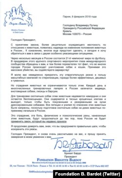 Французская актриса Брижит Бардо призвала президента России запретить убийство бездомных животных. В письме Владимиру Путину она выразила обеспокоенность отловом собак и кошек во время подготовки к Чемпионату мира по футболу-2018.