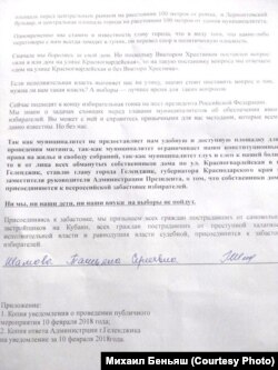 Речь идет о группе "обманутых дольщиков", пытающихся признать законным строительство 400-квартирного дома в ЖК "Адмирал", в котором они купили квартиры. В 2014 году власти Геленджика через суд добились признания этой стройки незаконной. Суд постановил, что дом должен быть снесен за счет владельцев квартир. Хозяева жилья неоднократно устраивали акции протеста в Геленджике и в Москве.