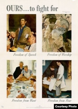 Александр Генис: Нью-Йоркское историческое общество – первый музей города, основанный еще в 1804 году. Этим летом эта достопочтенная организация устроила мемориальную выставку, посвященную 75-летию знаменитой передвижной выставке четырех плакатов Нормана Рокуэлла. В разгар войны, в 1943 году, художник написал четыре работы, аллегорически, но вполне реалистично изображающие те четыре свободы, за которые страна тогда сражалась. И вот три четверти века спустя музей вновь предоставил возможность полюбоваться этими плакатами, чтобы, как я думаю, вспомнить о том, что объединяет страну, разделенную сейчас на два чуть ли не непримиримых лагеря – сторонников и противников президента Трампа.