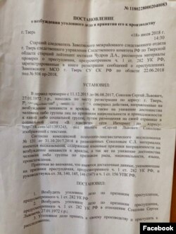 СК РФ по Тверской области возбудил уголовное дело по ч.1 ст. 282 "Возбуждение ненависти либо вражды, а равно унижение человеческого достоинства" на 46-летнего Сергея Соколова. По версии следствия, посты и картинки, которые Соколов разместил на своей странице в социальной сети "ВКонтакте", содержат "языковые признаки направленности на возбуждение ненависти и вражды, а также на унижение достоинства человека либо группы по признакам расы, национальности, языка, происхождения".