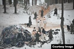 – Это исторический факт: евреев обвинили в том, что они связаны с советской властью, в том, что людей выслали в Сибирь. Немецкая пропаганда доказывала, что евреи и советская власть – это одно и то же, и это якобы объясняло, почему их задерживают, почему их отправляют в гетто и убивают в конце концов. Эта символика взята со старых фотографий, которые во время войны были сделаны в Риге, в Латвии.