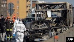 В Италии водитель автобуса с детьми протаранил на нём несколько полицейских машин, а затем поджёг его. Всего в этот момент в автобусе находились более 50 школьников. Некоторых из них преступник связал.