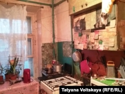 Дальше кухня: ободранные стены, столики, шкафчики, кастрюли, сковородки, на закопченном облезлом потолке – "лампочка Ильича". Раковина выглядит экстравагантно – там смеситель с душем: ванной в квартире нет.