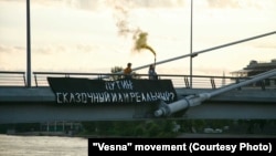 7 июня активисты "Весны" вывесили на Лазаревском мосту баннер с надписью: "Путин сказочный или реальный?".