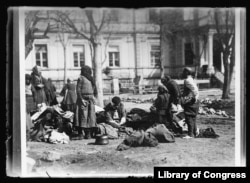 "Кто не моется, тот не ест", – с этим лозунгом американский Красный Крест работал на Балканах. Снимок сделан на территории нынешней Северной Македонии в июле 1919 года. Это база американского Красного Креста в городе Монастир (Битола) недалеко от границы с Грецией. Человек справа на фотографии только что помылся. Остальные ждут своей очереди. Группа людей перед зданием – интернированные, которые возвращаются из Болгарии домой. Заставляя людей мыться, Красный Крест пытался остановить эпидемию тифа и других инфекционных заболеваний в послевоенной Европе. Человек получал карточку на еду только после того, как принимал душ. В это время его одежду стерилизовали и делали на ней пометку, что этот беженец или бывший интернированный чист.