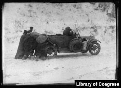 Это машина Красного Креста на переезде из Будапешта (в Румынии) через вечно покрытые снегом горные вершины в Болгарии по дороге к сербскому Пироту. Порой было так холодно, что мотор глох. И тогда окрестные крестьяне помогали толкать транспорт.