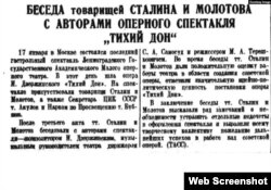 Еще до премьеры в Большом "Тихий Дон" показал на гастролях в Москве Ленинградский Малый оперный театр – МАЛЕГОТ (сейчас он называется Михайловским, как до революции). Последний гастрольный спектакль 17 января почтил своим присутствием Сталин со свитой. В антракте Иван Дзержинский, дирижер Самуил Самосуд и режиссер Макс Терешкович были приглашены в ложу "отца народов". Через несколько дней в "Правде" появилась заметка "Беседа товарищей Сталина и Молотова с авторами оперного спектакля "Тихий Дон".