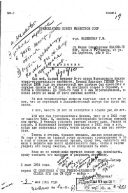 После смерти диктатора И. Сталина у родных и близких репрессированных возродилась надежда на воссоединение, несмотря даже на то, что со многими связь была потеряна не один год назад. Перед вами одно из обращений родственников в высшие советские инстанции. Думаю, вы обратили внимание на рукописные пометки на письме несчастной матери. Она расписалась в том, что ее устно уведомили о смерти сына, наступившей 1 июля 1943 г.
