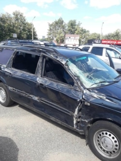 Житель Гродно Владимир Чарауха ехал вместе с женой и ребенком вечером 11 августа по городу. По его словам, белой ленты на машине не было и он не сигналил. Семья ехала по своим делам. Неожиданно, когда движение замедлилось, к его машине подбежали люди в черной форме без опознавательных знаков и начали бить кулаками в стекла. Испугавшись за свою семью, Владимир выехал на встречную полосу, но в этот момент кто-то ударил дубинкой по лобовому стеклу. Оно треснуло, а в бок его машины в этот момент въехал бронеавтомобиль "Тигр".