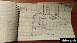 "Ворота если открываются, то первое, что вы видите, – это площадка, две скамеечки, стол. Это место для курения сотрудников. Задержанных туда не выпускают на прогулку", – показывает Алексей рисунки.