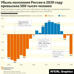 • Естественная убыль населения в 2020 году выросла больше чем в два раза – до 688,7 тысячи человек с 316,2 тысячи в 2019 году. Этот показатель стал максимальным с 2005 года.