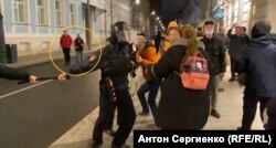 Около 9 вечера голова колонны протестующих достигла перекрестка Рождественского бульвара с Малым Кисельным переулком. Здесь и развернулись события, которые показались нам подозрительными. На видео корреспондента Радио Свобода Антона Сергиенко попали сразу несколько странных эпизодов. Его полная версия в нашем плеере – это два склеенных друг с другом куска длительностью 59 и 22 секунды, снятые практически один за другим: