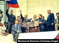 Оказывается, нас видела по телевизору в Испании моя семья. Конечно, тогда не было мобильных телефонов, звонки мы делали на почте, заказывали звонок в Испанию, ждали: "Испания, третья кабина, говорите". Они ничего не знали, знали только, что путч, что я там. Пока я смогла дозвониться, прошло три-четыре дня. Потом уже в консульстве мне сказали, что я должна поменять билет обратно домой, я сказала, что я никуда не поеду, я остаюсь, тем более, что у меня билет в Грузию через неделю. "Ты с ума сошла, не думаешь о своих родителях, как они переживают?" – сотрудник посольства. "Они знают, что я справлюсь". Полетела потом в Грузию. Когда я вернулась из Грузии, я познакомилась с грузинкой в моем родном городе. В Испании проходят праздник каждого города, который длится примерно три дня, летом в основном. Наша семья всегда ходила на танцы, всегда приглашали коллективы из разных стран, из России, из Украины, с Кавказа, из Грузии. Приезжал ансамбль из Грузии, я была в восторге, обожаю эти танцы. Я познакомилась с переводчиком Мананой, потом переписывались, она меня пригласила в Тбилиси. После путча поехала в Тбилиси, там побыла у них на даче, меня очень хорошо, конечно, встретили. Я прилетела в аэропорт, стою, Манану не вижу, ко мне подходили таксисты: "Девушка, вы наша?" – "Да, в какой-то степени ваша". Связана с Россией, у меня такие ощущения, опыт уникальный. Так получилось, что после путча, две недели спустя после этого, была выставка фотографий профессиональных журналистов, фотографий путча во Дворце съездов, в Белом доме. Я, конечно, пошла на выставку. Тут, смотрю, в огромном размере фотографии, я себя там вижу на одной фотографии, на двух, вернее, рядом с Ельциным, с охраной у этого балкона, где Ельцин выступал с речью. Я обратилась к агентству ТАСС, нашла адрес, сказала: "Так и так, я хотела бы приобрести, купить эти фотографии". Я купила их в большом размере и в маленьком.