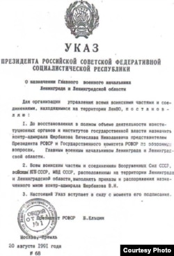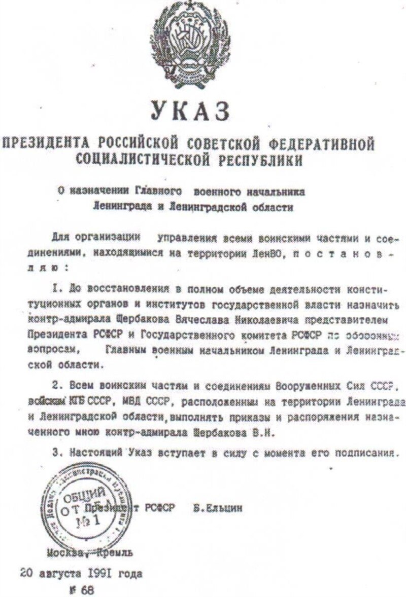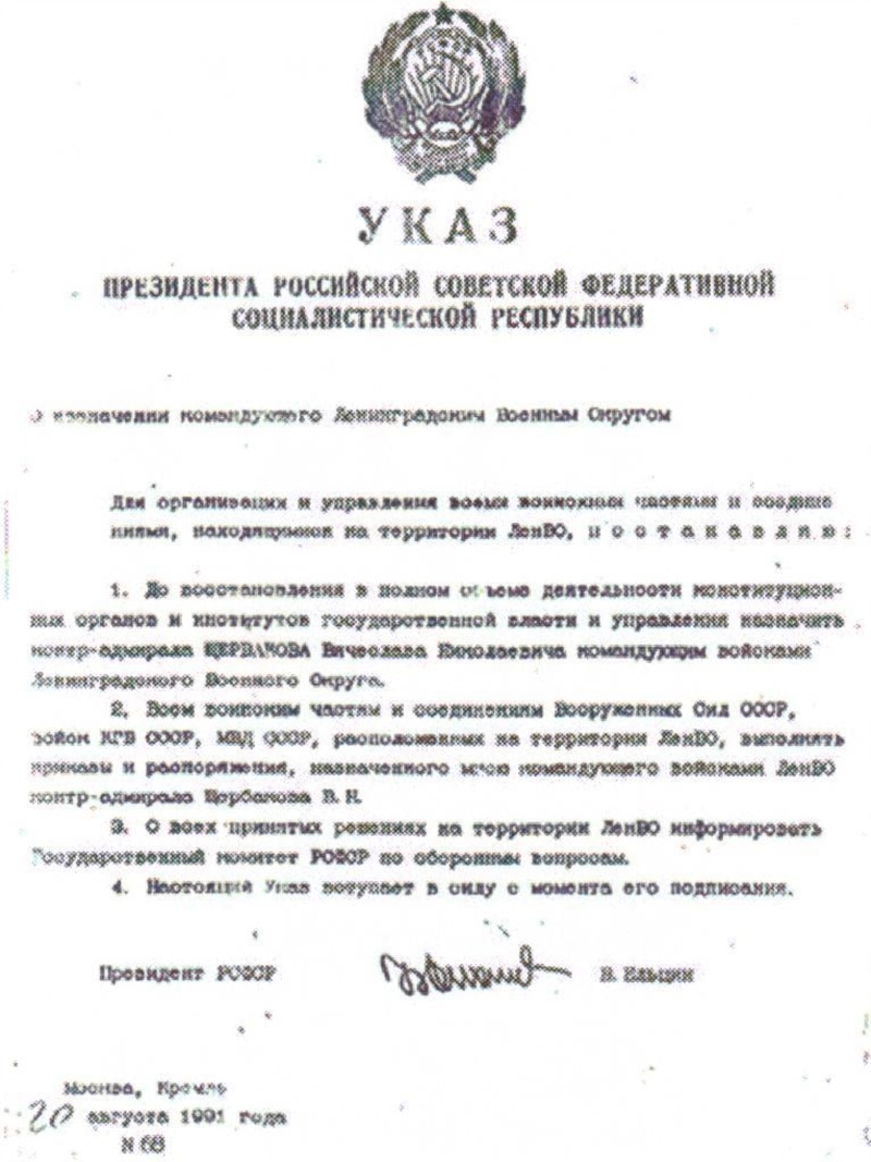 20 августа, почти все время, пока шла чрезвычайная совместная сессия Ленсовета-Леноблслвета, я дежурила у телефонов и факса в кабинете Александра Николаевича Беляева, поддержавая связь с Москвой. В 17 ч.40м. поступили два Указа Президента РСФСР, в том числе Указ № 68 "О назначении командующего Ленинградским Военным Округом" (назначался вице-мэр, контр-адмирал Вячеслав Николаевич Щербаков). Собчак, зачитывая этот Указ, изменил его формулировку на следующую: "О назначении Главного военного начальника Ленинграда и Ленинградской области". Такой должности, как известно, не существует, и А.Собчак не мог этого не знать. Изменив формулировку указа, А.Собчак спас Виктора Самсонова; ведь Указ № 68 означал не только назначение Вячеслава Щербакова на должность начальника командующего ЛВО, но и смещение с этой должности генерал-полковника Самсонова.
