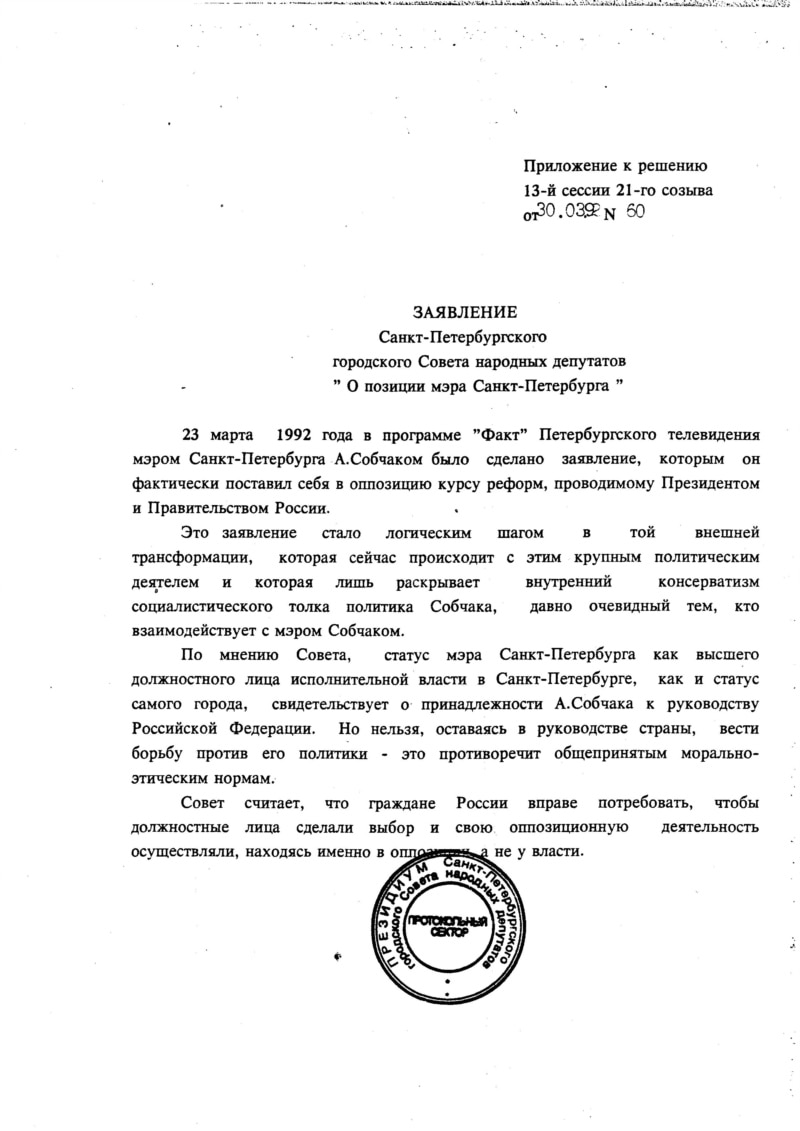 30 марта 1992 г. 13 сессия Петросовета приняла решение "О целесообразности освобождения от должности мэра Санкт-Петербурга А.А.Собчака и обращении к Президенту РФ и в Конституционный суд РСФСР". Одновременно сессия приняла заявление "О позиции мэра Санкт-Петербурга", которое я привожу полностью.