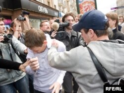 Под транспарант оперативно подтянулись противники гомосексуализма и репортеры. Бородатый мужчина скандирует: "Пидорасам не место в Москве!"