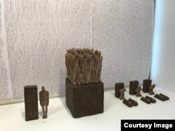 – Я начал его 6 декабря, уже находясь во Франции. Он экзистенциальный и психотерапевтический в каком-то смысле. Сублимирующий, так сказать, мое самое большое желание. Я пишу фразу "Я хочу, чтобы кончилась война" на больших листах, стараюсь делать это каждый день. Использую несколько языков – обязательно английский, русский и украинский, также добавляю языки тех стран, где я нахожусь. Уже были французский, немецкий, армянский, иврит, чешский. Иногда я включаю в эти работы графику. Сейчас сделано уже больше ста листов. Проект не случайно называется "Время войны". Это визуализация времени. Желание, выраженное в этой фразе, – некий бесконечный фон. У тебя в голове свербит эта фраза, но ты не можешь ничего сделать, только пишешь и пишешь ее, тратишь на это уйму времени. Может быть, это глупое занятие, но оно психологически помогает хоть как-то выразить это чувство. Вообще, это характерно для моей практики как художника – работать на повторе, делать какие-то длительные темпоральные вещи. Проект выставлялся уже в нескольких местах, во-первых, в маленькой галерее в Париже, потом я ездил с ним в Гаагу, потом в резиденцию в Брно. Также я показываю хлебные скульптуры, которыми я продолжаю заниматься. Не так давно я начал серию "Кубики". Это кубы, сформированные из человеческих фигур – люди стоят плотными рядами, как солдаты, которых построили в каре, и такого же размера кубики, сделанные из земли. В Женеве я решил еще показать видеодокументацию двух старых перформансов, которые так или иначе имеют отношение ко времени, к человеческим страданиям – "По кругу" и "Основной вопрос".