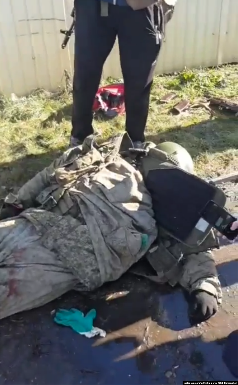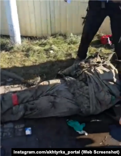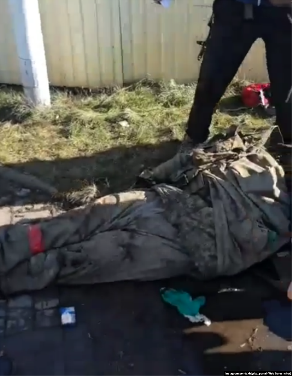 Тело убитого российского военного на улице города Ахтырка Сумской области.