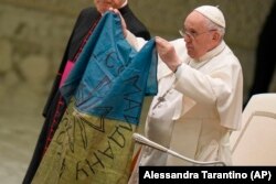 Папа Римский Франциск во время еженедельной аудиенции продемонстрировал украинский флаг, присланный ему из Бучи, города вблизи Киева, где после отступления российских войск были найдены убитыми множество мирных жителей. Понтифик назвал произошедшее "резней в Буче" и вновь призвал к прекращению войны.