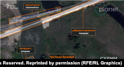 Спутник Planet Labs зафиксировал достроенную переправу рядом с разрушенным железнодорожным мостом.