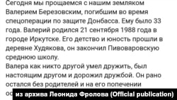 Несколько часов спустя Фролов убрал из текста фразу про командировку контрактника Березовского в 2014 году в Украину.