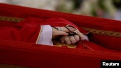 Как сообщает Reuters, Ватикан распространил фотографии папы Франциска, лежащего в литургических облачениях в открытом деревянном гробу, установленном в часовне резиденции Санта-Марта — именно там он проживал с начала своего понтификата, отказавшись от традиционных покоев Апостольского дворца. Почётный караул у гроба несут швейцарские гвардейцы.