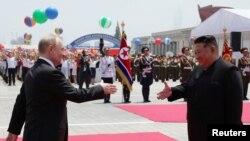 Лидеры несколько раз обнялись на красной ковровой дорожке, а потом долго приглашали один другого первым сесть в лимузин. На улицах Пхеньяна развесили российские флаги и портреты Путина.