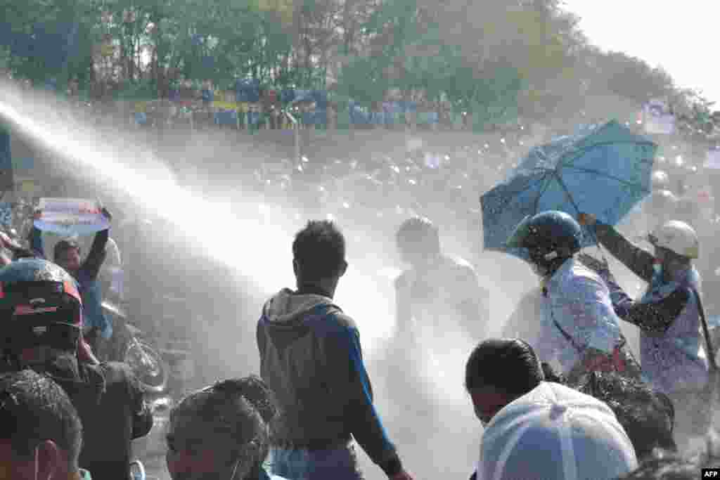 Полиция разгоняет протестующих водометом в Нейпьидо, 8 февраля 2021 года