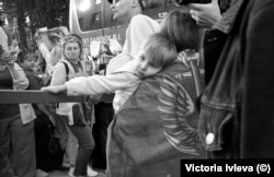 Из окна автобуса они видят радостную толпу встречающих: это все те, для кого война стала ощутимой на личном, частном уровне отдельной семьи – их родные мужчины ушли защищать Украину и пропали без вести или оказались в российском плену. Одни разворачивают огромные, чуть не в человеческий рост баннеры с именами и фотографиями сыновей, братьев, мужей, друзей, другие держат самодельные плакаты, а кто-то и просто тетрадные листы с фамилиями. Многие знакомы: принимают участие в постоянных акциях поддержки военнопленных - так они поддерживают и друг друга.