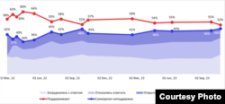 И третья точка изменений – это то, что произошло сейчас, причем на протяжении очень небольшого периода с сентября по октябрь, когда поддержка войны несколько уменьшилась в связи со следующей стадией усталости и с осенним призывом в армию, невозвратом мобилизованных год назад, расширяющимся публичным протестом жен мобилизованных. Сейчас она составляет 52%.