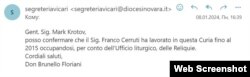 Чтобы подтвердить или развеять сомнения относительно подлинности мощей, подаренных Михаилом Даниловым московскому храму, Радио Свобода решило обратиться к первоисточнику – епархии итальянского города Новара. Мы написали электронное письмо на адрес епископального викария Дона Брунелло Флориани с вопросом о том, может ли он подтвердить, что сертификаты 2011 и 2013 годов выданы епархией Новары, приложив их фото. Помимо этого, мы спросили, числится ли в ней иподиаконом Франко Черрути. Уже через 15 минут мы получили ответ, в котором говорилось, что тот действительно служил в курии Новары, заведуя хранилищем реликвий. По словам Флориани, работа Черрути на этой должности закончилась в 2015 году – то есть за 3 года до даты, указанной на сертификате с его подписью о подлинности мощей св. Николая, подаренных владельцем "Мутабора" настоятелю подведомственного Администрации Президента РФ храма.