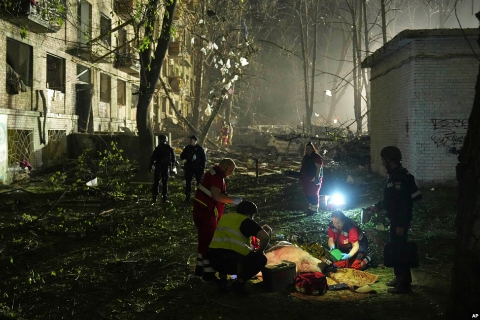 Жители дома, поврежденного российским ударом, наблюдают за расчисткой завалов в надежде на спасение своих родных, Киев