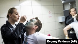Навальный подвергался нападениям – на этой фотографии он после того, как ему в 2017 году в Москве плеснули в лицо зеленкой.