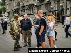 Напротив штаба быстро собралась толпа горожан, кто-то пришел с семьями, некоторые – с детскими колясками и собаками на поводке. Одни обсуждали между собой политическую обстановку, другие общались с людьми в камуфляже. Жители делали фото с военными и селфи на фоне танка, снимали на телефоны – никто не мешал. Два иностранных журналиста вели прямой эфир. Кажется, никто не воспринимал угрозу людей с оружием всерьез.