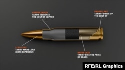 На этой схеме показано, что вырастут цены ряда компонентов обычной пули – из-за подорожания такого сырья, как медь и свинец: