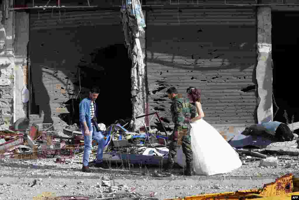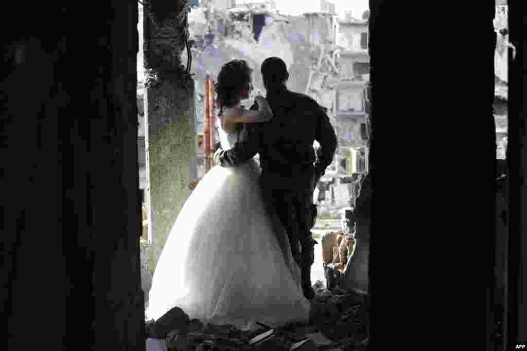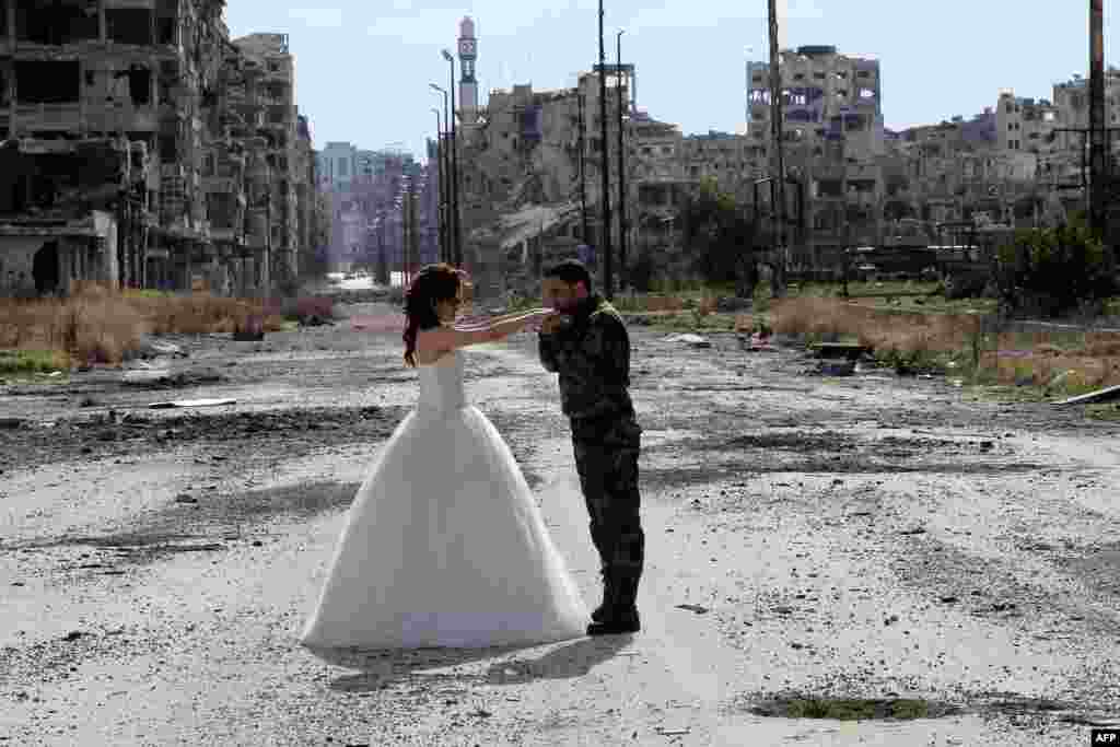 За пять лет войны в Сирии город Хомс превратился в сплошные развалины. Сейчас Хомс находится под контролем сирийской оппозиции, авиация Башара Асада, а также российские ВВС регулярно бомбят город. Но жизнь в Хомсе продолжается. Фоторепортер агентства AFP запечатлел свадьбу 18-летней Нади и 27-летнего Хасана. Она состоялась 5 февраля.