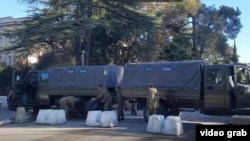 Протестующие демонтируют ограждения вокруг здания администрации президента, парламента и правительства, которые были заняты ими 15 ноября, сообщает корреспондент ТАСС.