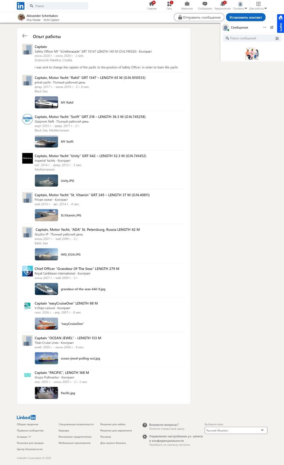 Радио Свобода также нашло в интернете одного из предыдущих капитанов "Шехерезады", Александра Щербакова. Судя по данным об опыте работы в его профиле в LinkedIn, Щербаков работал на "Шехерезаде" всего 2 месяца, в июне и в июле 2020 года, то есть был первым капитаном после ее постройки.