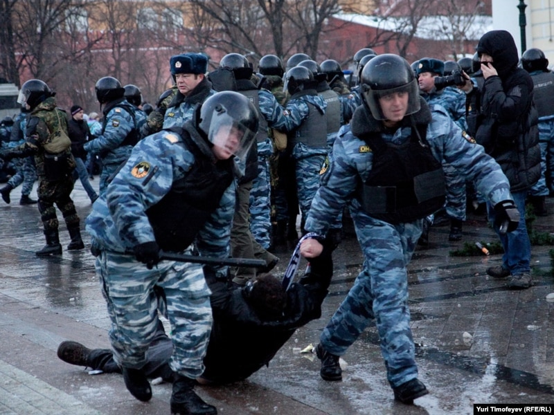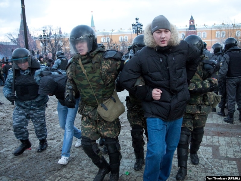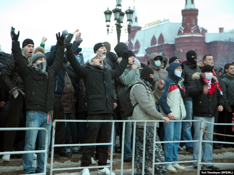 Корреспондент Радио Свобода работал на Манежной площади, где футбольные фанаты, пришедшие с акции памяти убитого Егора Свиридова, устроили погром. Движение на Моховой улице было полностью перекрыто. Сообщения о том, что идет бой между ОМОНовцами и агрессивно настроенной толпой, не подтвердились. Однако толпа спустилась в метро, где стала нападать на граждан с кавказской внешностью.